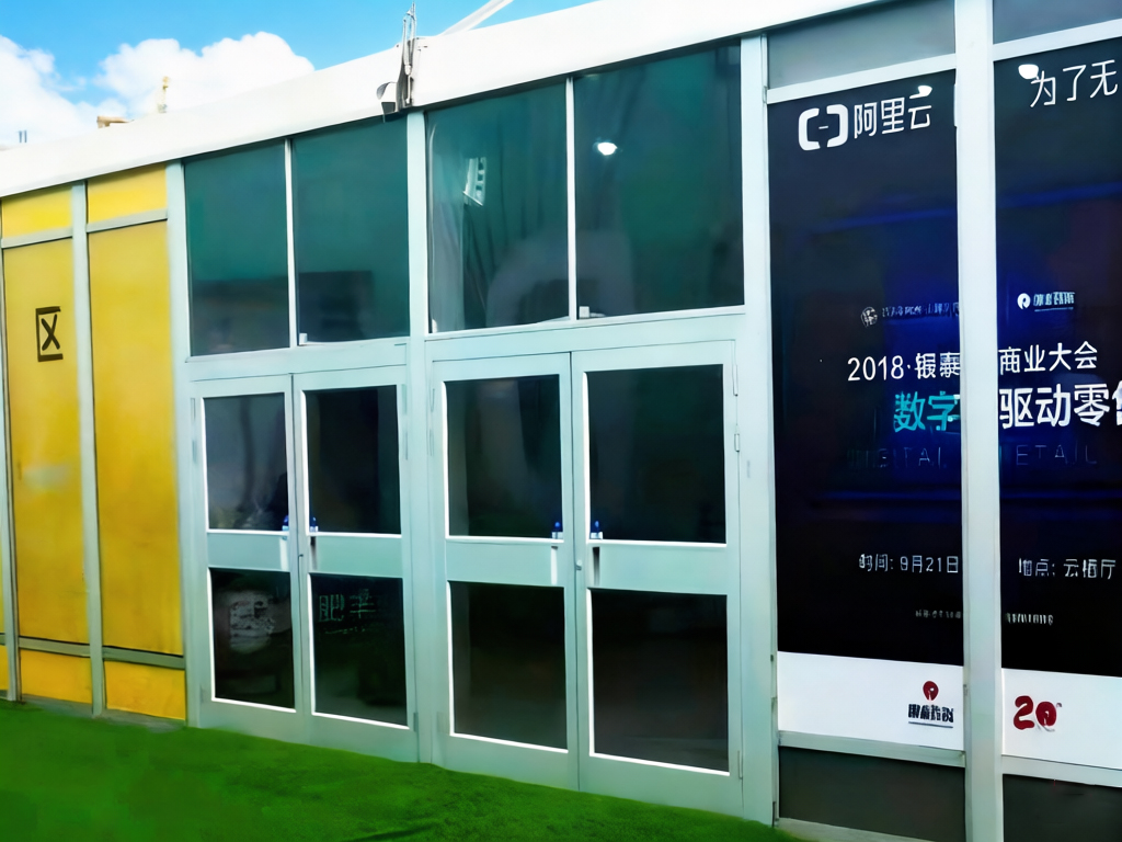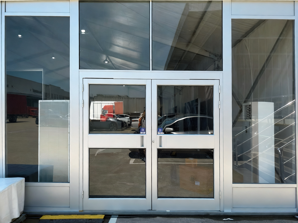 钢化玻璃门是篷房选配的重要设施之一。整体采用铝合金边框+钢化玻璃的结构,钢化玻璃厚度6mm。门扇采用弹簧合页,自动缓慢(可调)开闭合。高档美观,实用安全,采光通透性好,是高品质空调篷房必选设施。